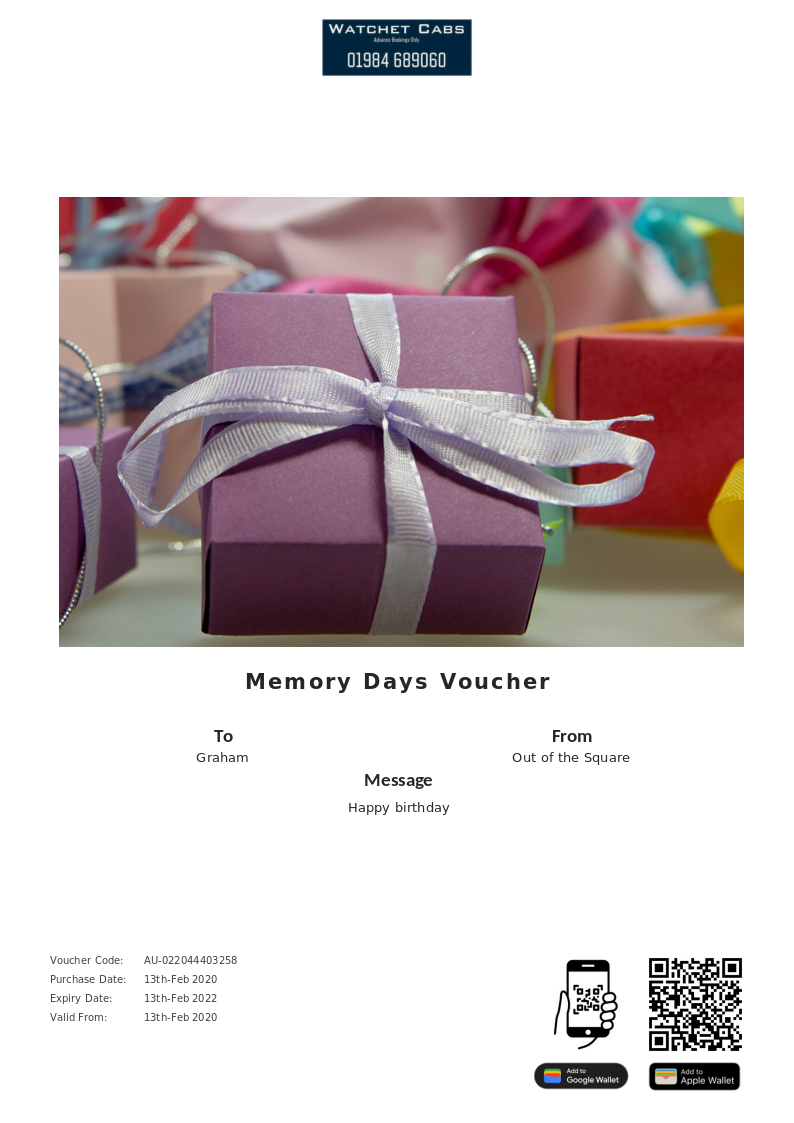 Watchet Cabs allows you to purchase instantly printable gift vouchers, special offers and tickets using the Voucher Connect platform.
